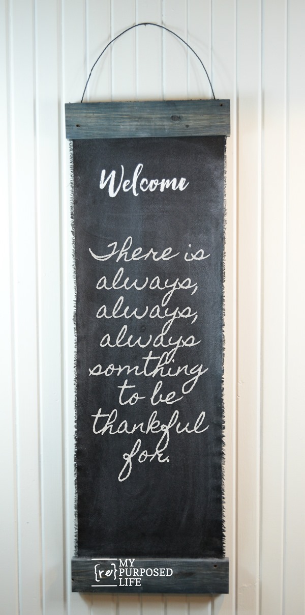 This is where the drop-cloth chalkboard currently hangs in my home. It makes me smile every time I walk by it. It currently has the Welcome transfer from my The Junky Chalker online store. I tried writing the word welcome on it, but it didn’t look very good.