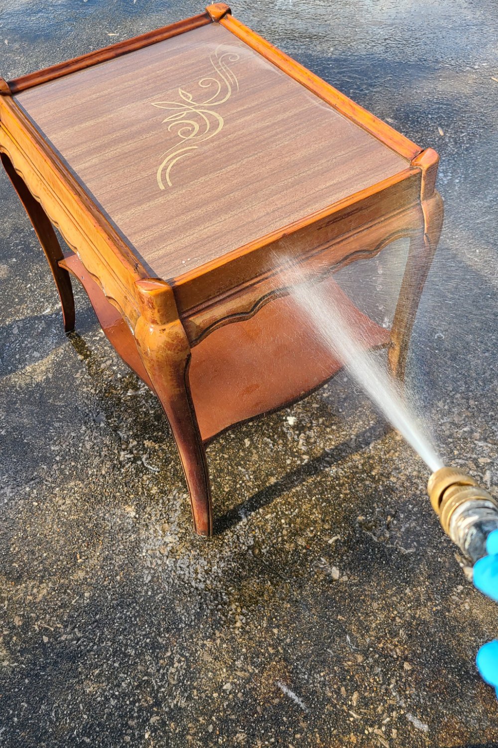 With the deglosser, there is no need to rinse. However, with this concentrated cleaner, you need to rinse it off to prepare furniture for painting. I hit it with the hose and left it in the sunshine to dry thoroughly.